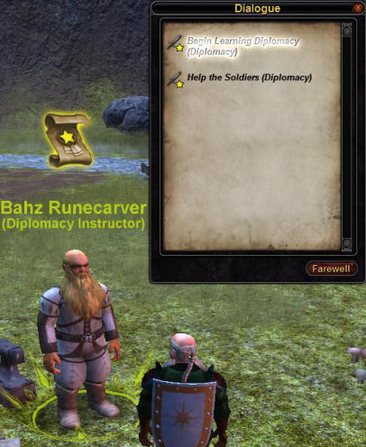 La diplomacie c'est 50 niveaux à monter simplement en allant discuter avec acharnement avec les différents pnj du jeu, afin de batailler des informations, réaliser des conversations intéressantes et surtout avoir le dernier mot.