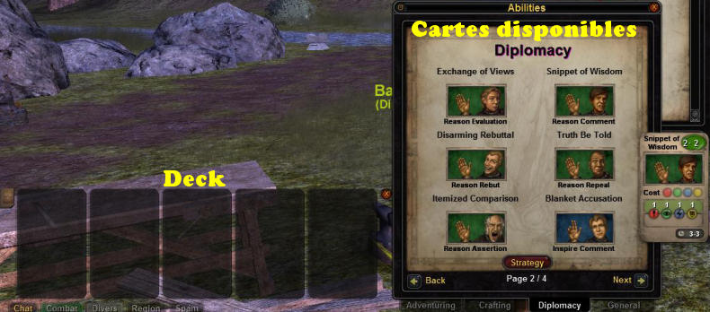 | | Préparer son deck en fonction de son adversaire | Vous avez du remarquer en tournant les différentes page de la fenêtre des abilities de diplomacy que vous avez des cartes de plusieurs couleurs (rouge, vert, bleu et jaune). Chaque couleur correspond à l'attitude, le comportement , la tournure de phrase de votre dialogue. Rouge : Demand (vous demandez) Vert : Reason (vous raisonnez) Bleu : Inspire (vous inspirez) Jaune : Flatter (vous flatez). En fonction de vos adversaires vous saurez quels types de conversations vous pourrez tenir avec eux. Certains ne vous permettront pas d'utiliser une couleur, d'autres n'y verrons pas d'inconvéniants.