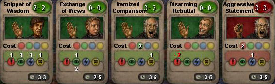 | Pour commencer à remplir votre deck, identifiez la carte Snippet of Wisdom (indispensable pour débuter le parley de tutorial) et déplacez la dans un emplacement vide de votre deck. Si vous ne savez pas quoi mettre d'autre, je vous conseille en plus : - Exchange of views (vert), - Itemized comparison (vert), - Disarming rebuttal (vert), - Aggressive statement (rouge). Vous voilà avec un deck complet. |  |