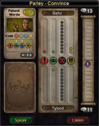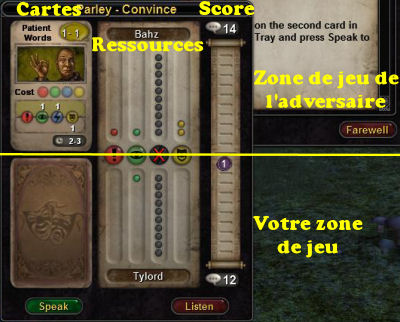 | | Description de la fenêtre du Parley | La fenêtre de Parley est celle où va se jouer votre échange verbal. Elle se découpe en plusieurs parties : La moitié horizontale supérieure : zone de jeu de votre adversaire, la moitié inférieure, votre zone de jeu. Ensuite de gauche vers la droite : - la carte en cours, celle qui vient d'être sortie, - les ressources à disposition des deux joueurs, - le score avec le nombre de tours restants.