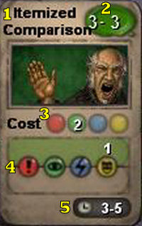 Dans le cas de notre carte Itemized Comparison, si vous la jouez en parley, elle vous rapportera donc 3 points, elle vous coûtera 2 ressources vertes pour la sortir, elle fera gagner une ressource jaune à l'adversaire, et vous ne pourrez pas vous en resservir avant 3 à 5 tours.