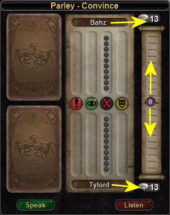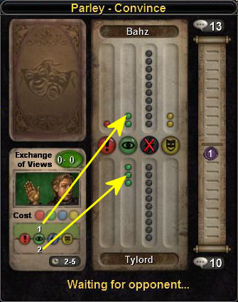 L'objectif est que vous meniez au score pendant le nombre de tours imposés afin de remporter le parley. Le score, la barre de droite, indique en haut le nombre de tours pendant lequel votre adversaire doit mener pour gagner. En bas à côté de votre nom, c'est le nombre de tours pendant lequel vous devez mener pour gagner. Ainsi Tylord doit mener aux points pendant 13 tours, et son adversaire de même.