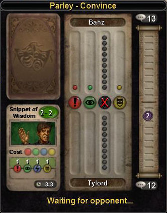 Nous reprenons l'exemple du parley du tutorial, c'est vous qui avez l'initiative, votre adversaire attend que vous placiez la carte Snippet of Wisdom pour lancer l'affrontement. Prenez la carte et déplacez là dans votre zone, celle du bas, de la fenêtre du parley. Vous pouvez aussi plus simplement double cliquer dessus.