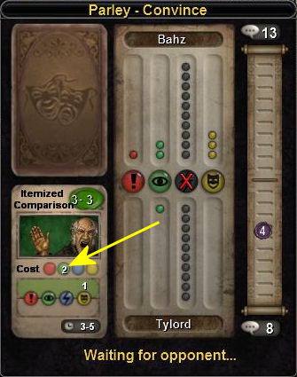 Cette carte à pour effet de : - lui faire gagner 1 point, réduisant le score actuel de deux en votre faveur, à 1 en votre faveur. Le curseur indique donc 1 et remonte d'une case, mais vous continuez de mener le parley, ainsi le nombre de tour restant à jouer diminue encore à votre avantage pour passer à 11. - lui faire gagner une ressource jaune, - vous faire gagner une ressource verte et une bleue (qui ne compte pas puisque le parley n'exploite pas le bleu).