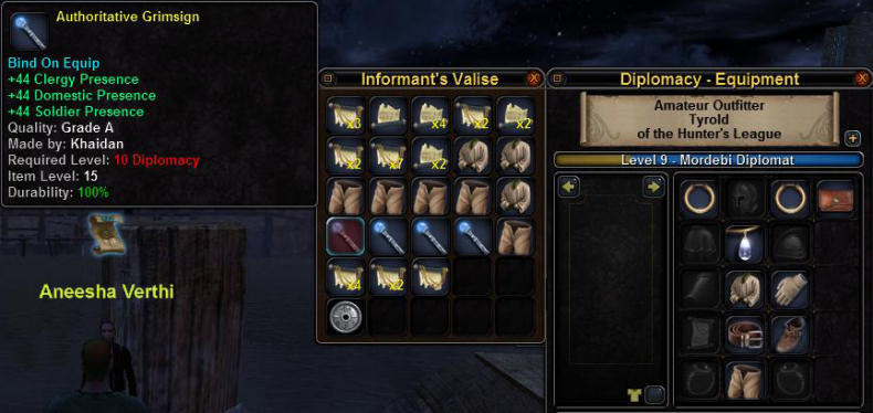 Au départ vous serez très souvent limités par manque de présence dans telle ou telle faction. Pour palier à cela il n'y a qu'une seule méthode : vous équiper ! Car la diplomacie, comme pour la sphère d'aventure, dépend tout autant de votre équipement. En aventure votre armure vous donne des points d'attributs, en diplomacie, elle va vous donner des points de présence.