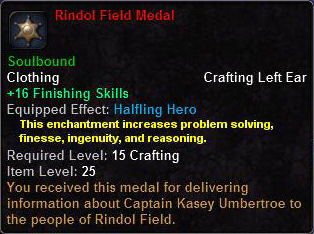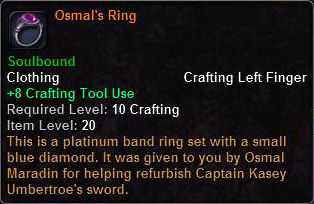 Vous trouverez Osmald au bord de la route juste sur la colline au nord du moulin à roue dans le village de Rindol Filed. Rindol Field : Testra, rift à Three Rivers puis griffon plein nord. Réparer une épée (quelle que soit votre classe de craft) : Recompense : ring (+8 crafting tool) Nota : vous devez être 12 en artisan et avoir 25 en faction Tursh & Rindol Field. Vous pouvez avoir rapidement 100 en faction en faisant la quête de Morras Goldfarn au moulin, qui consiste à réparer (juste toucher) quatre objets dans le village (une petite pierre à l'intérieur du couloir de la roue dans l'eau), un tonneau près du moulin, une barrière à la maison du maire (plus haut dans le village) ...