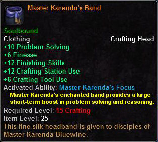 Si vous terminez la quête précédente de Karenda, il vous proposera celle ci qui mérite le détour. Objectif : fabriquer une partie de l'épée, nécessite un thorn, bois rare T2. Récompense : Head (+10 problem solving, +6 finesse, +12 finishing skill, +12 crafting station, +6 crafting tool) : lvl 15 mini pour l'équiper.