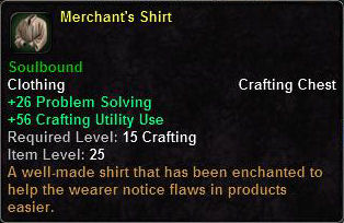 A faire en A pour de l'équipement : Tursh : Auprès du lieutenant près du broker lvl 20 - Merchant's Shirt (26 problem solving, 56 crafting utility) lvl 20 - Artist's Smock (Apron, 20 problem solving, 46 crafting station) |