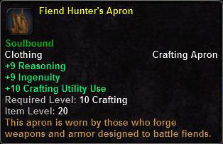 L'artisanat est assez complexe sur Vanguard, et si vous ne portez que l'équipement de base sur le dos, vous aurez du mal à réaliser des recettes de votre niveau. Pour mémoire, votre niveau de compétences doit être au minimum 10 fois votre niveau d'artisan afin de réduire considérablement les complications et assurer des progressions correctes. Par exemple vous être niveau 14, alors vos attributs (Problem, Reasoning, Ingenuity, Finesse) devront être à 140, de même que toutes vos skills. Mais impossible d'atteindre un tel niveau sans un équipement avec des bonus. Et cet équipement il va falloir soit se le faire crafter, soit plus simplement aller le chercher en faisant quelques quêtes d'artisanat. Voici une liste de quelques unes intéressantes. |